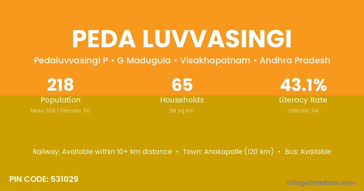 Peda Luvvasingi village has a total population of 218 people, of which 108 are males and 110 are females.