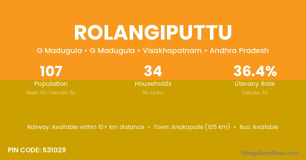 Anakapalle (105 km) is the nearest town to Rolangiputtu village for major economic activities and is located approximately 105 km away.