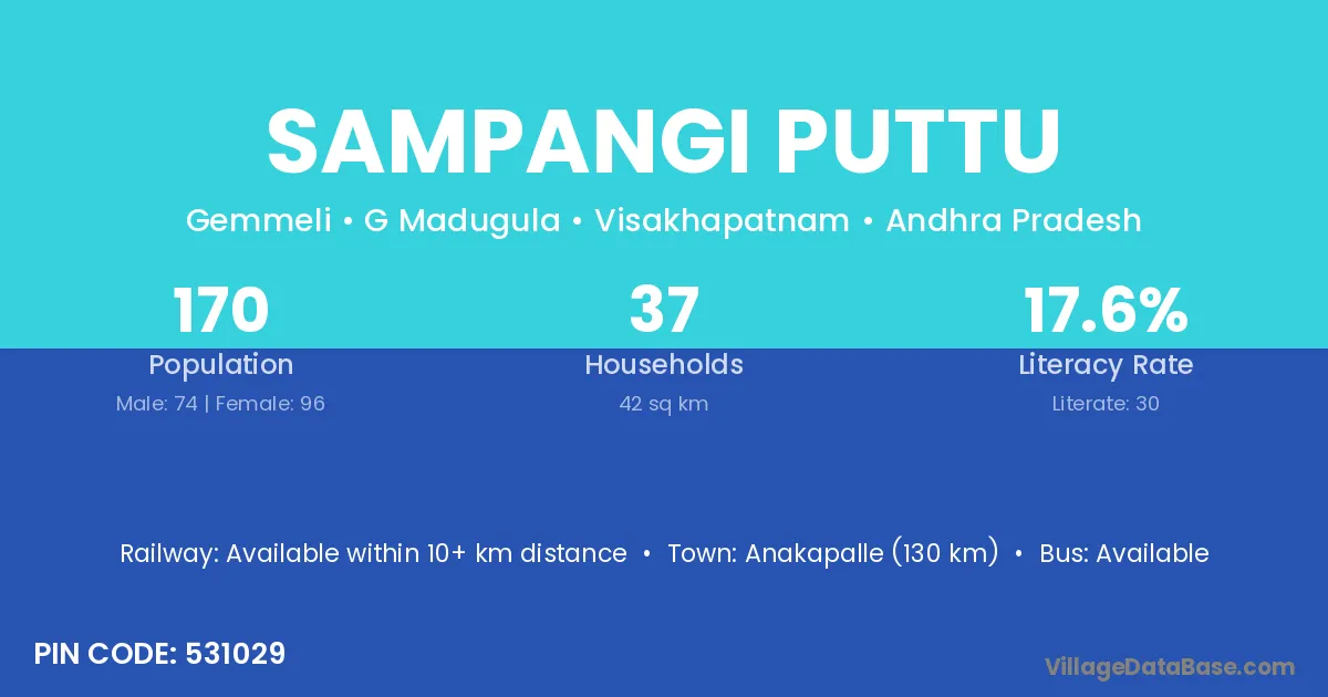 Anakapalle (130 km) is the nearest town to Sampangi Puttu village for major economic activities and is located approximately 130 km away.