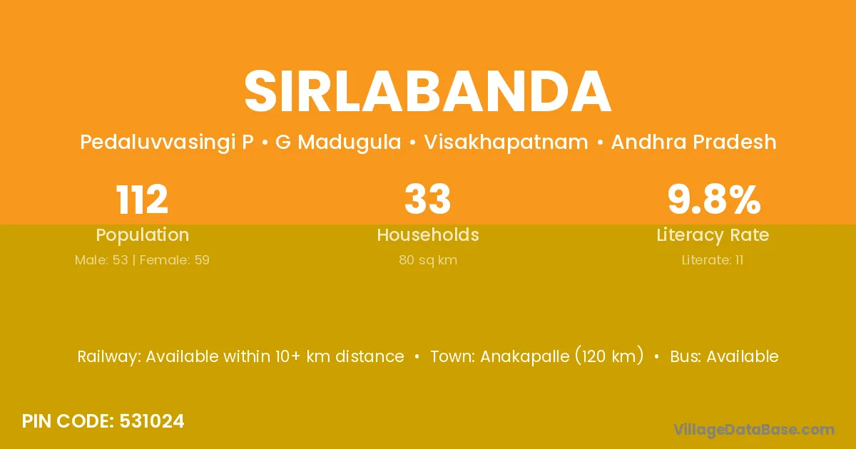 Anakapalle (120 km) is the nearest town to Sirlabanda village for major economic activities and is located approximately 120 km away.