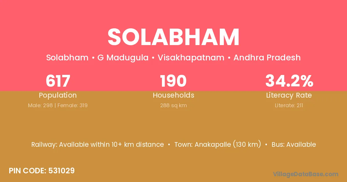 Anakapalle (130 km) is the nearest town to Solabham village for major economic activities and is located approximately 130 km away.
