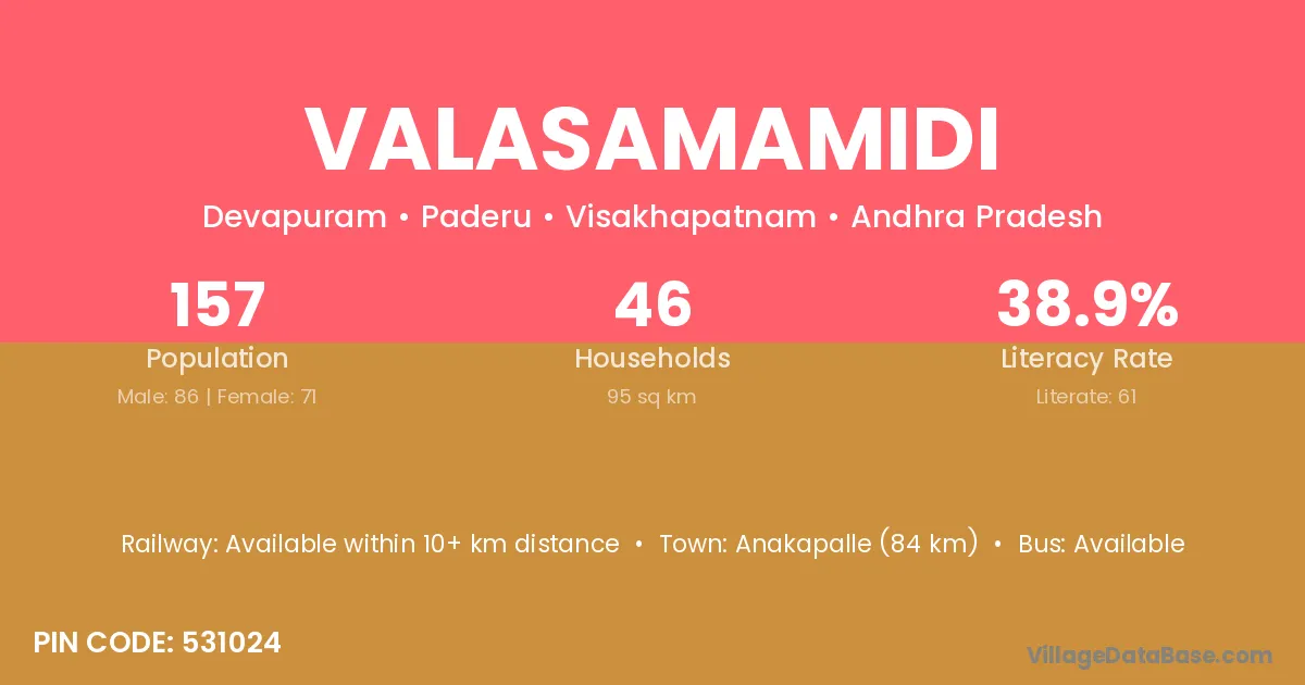 Anakapalle (106 km) is the nearest town to Valasamamidi village for major economic activities and is located approximately 106 km away.