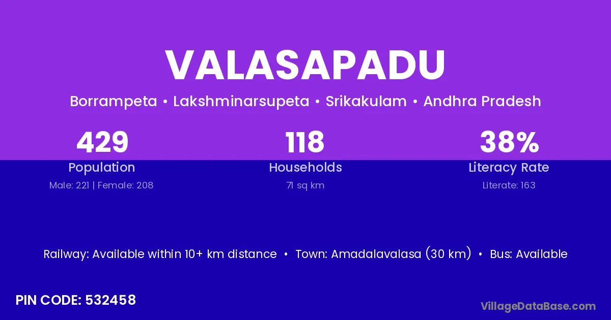 Anakapalle (138 km) is the nearest town to Valasapadu village for major economic activities and is located approximately 138 km away.