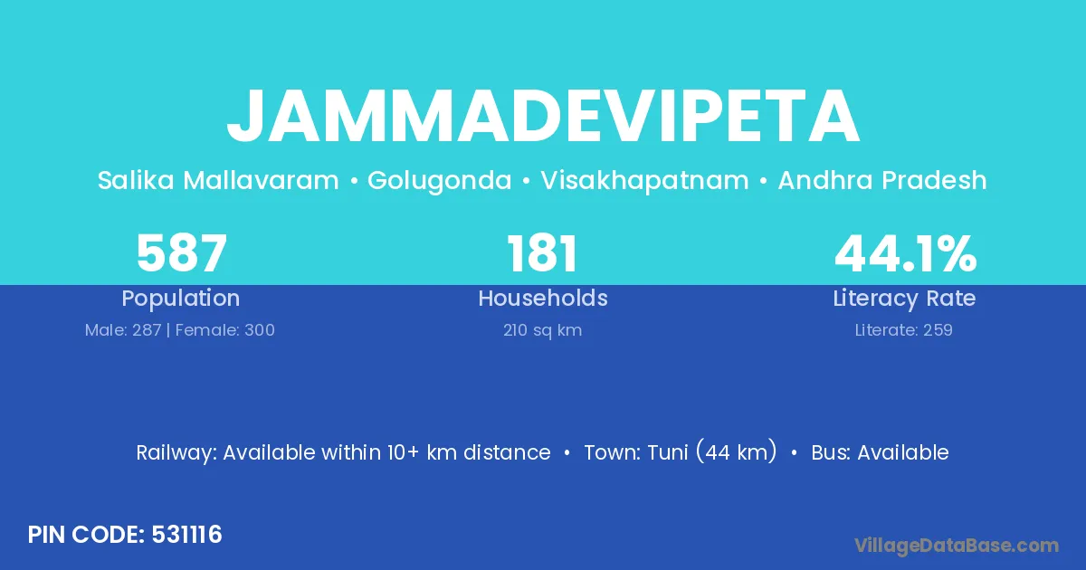 Tuni (44 km) is the nearest town to Jammadevipeta village for major economic activities and is located approximately 44 km away.