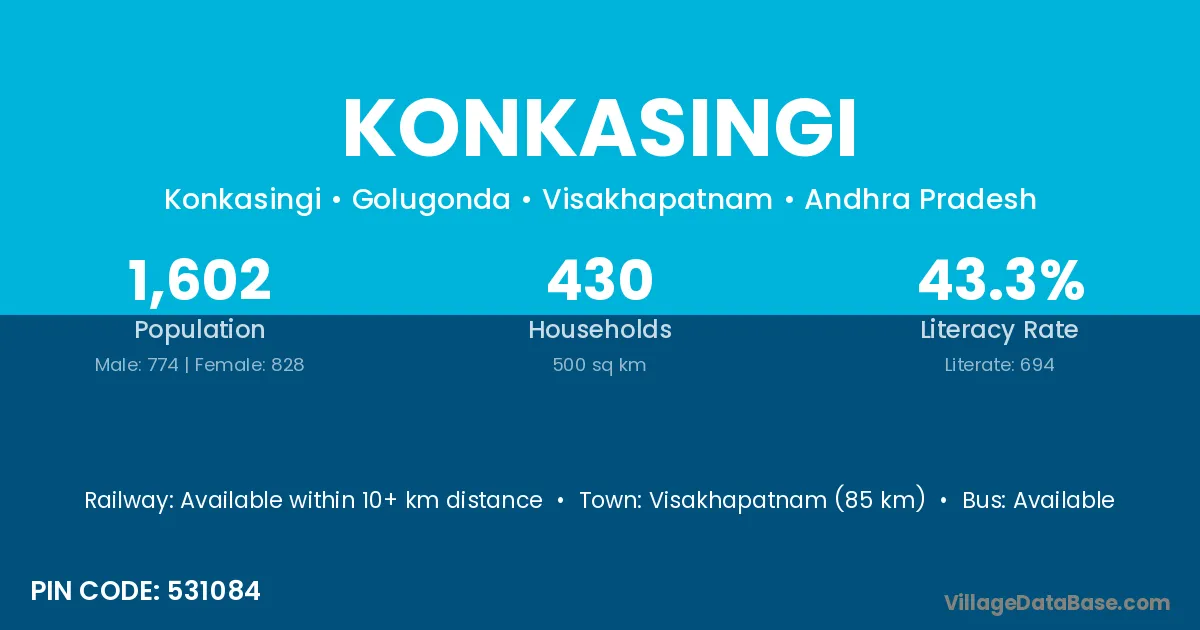 Visakhapatnam (85 km) is the nearest town to Konkasingi village for major economic activities and is located approximately 85 km away.