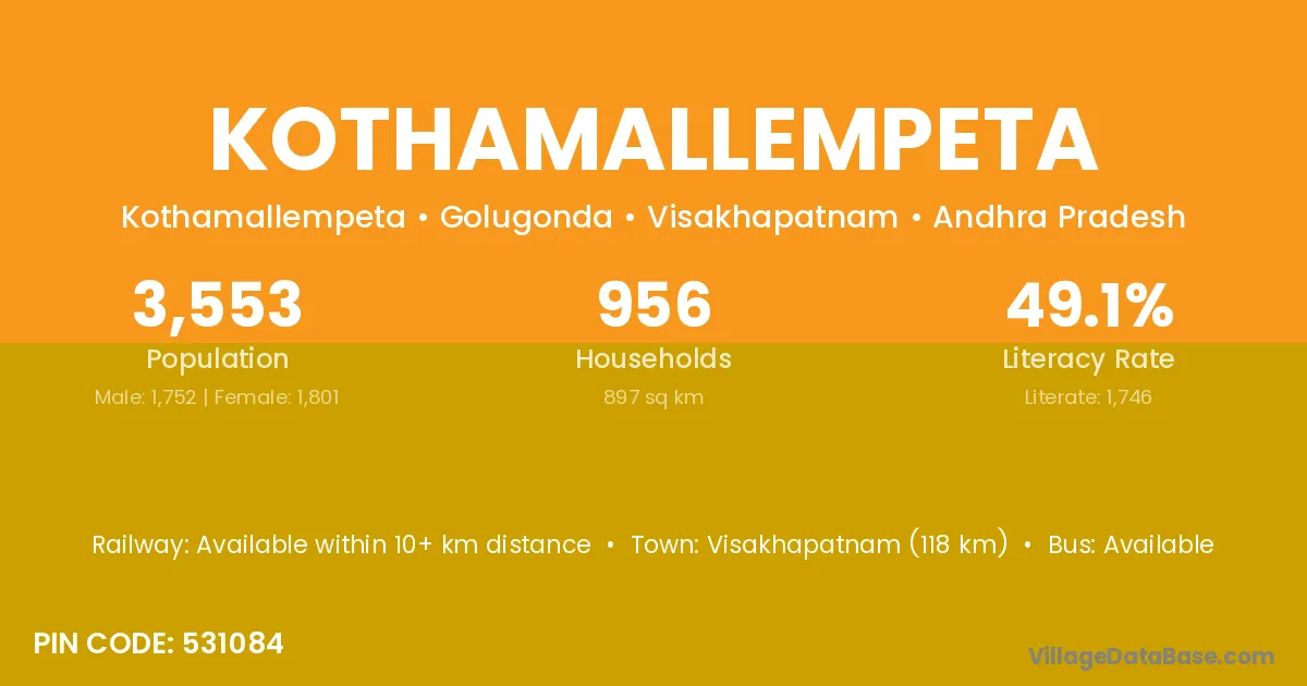 Visakhapatnam (118 km) is the nearest town to Kothamallempeta village for major economic activities and is located approximately 118 km away.