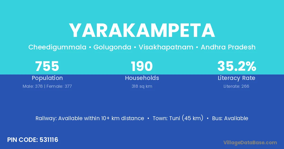 Yarakampeta village has a total population of 755 people, of which 378 are males and 377 are females.
