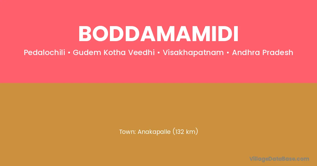 Anakapalle (132 km) is the nearest town to Boddamamidi village for major economic activities and is located approximately 132 km away.