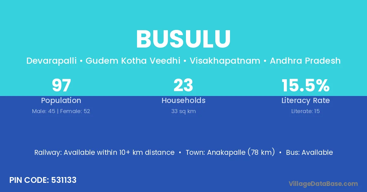 Anakapalle (78 km) is the nearest town to Busulu village for major economic activities and is located approximately 78 km away.