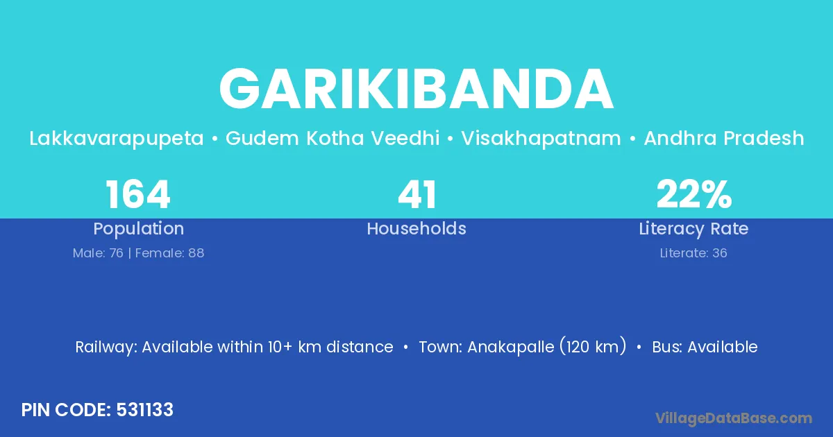 Anakapalle (120 km) is the nearest town to Garikibanda village for major economic activities and is located approximately 120 km away.