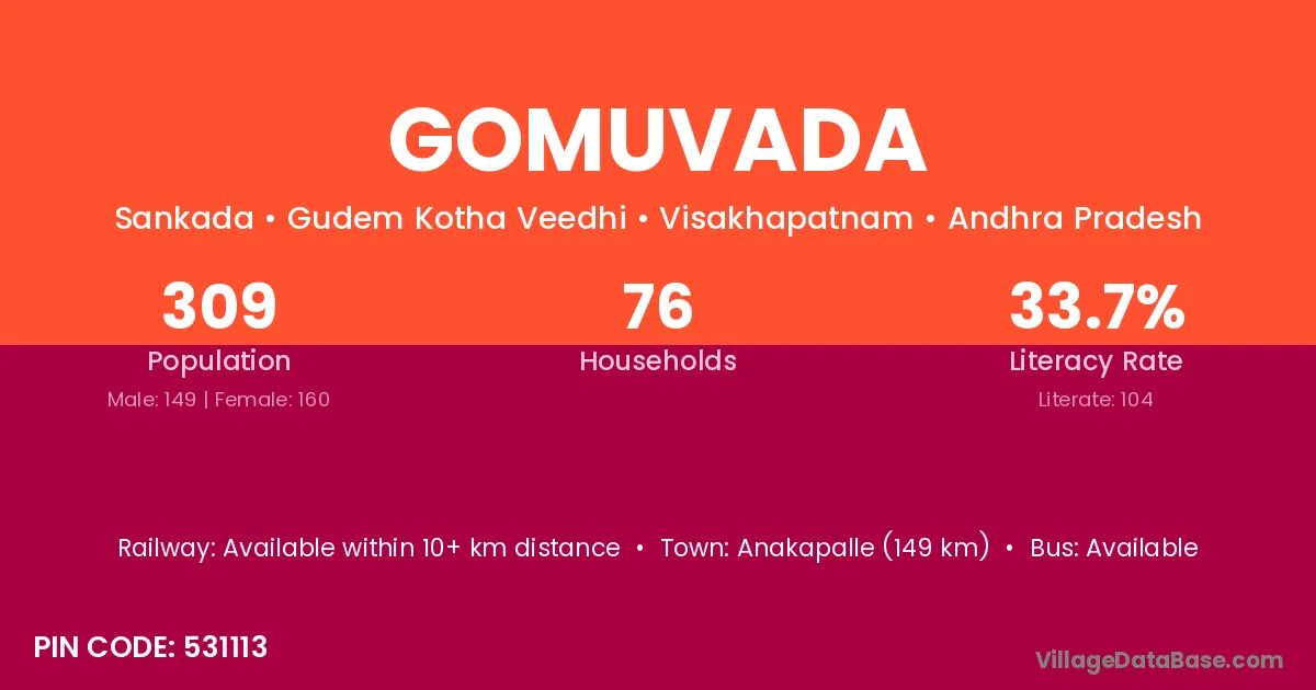 Anakapalle (149 km) is the nearest town to Gomuvada village for major economic activities and is located approximately 149 km away.