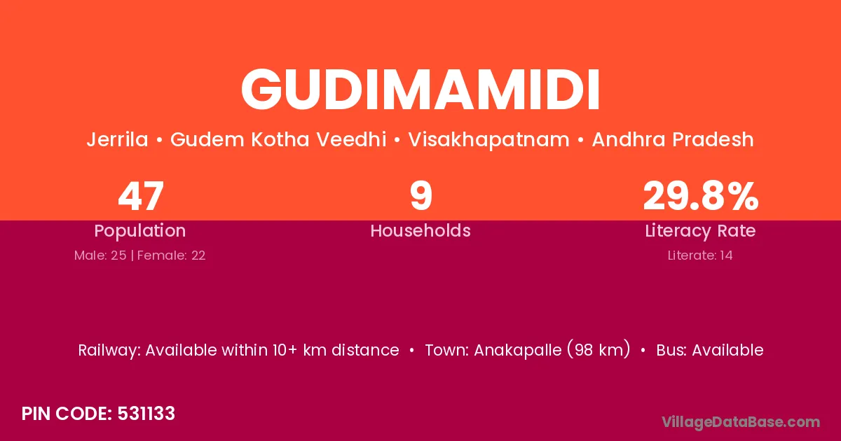 Gudimamidi village has a total population of 47 people, of which 25 are males and 22 are females.