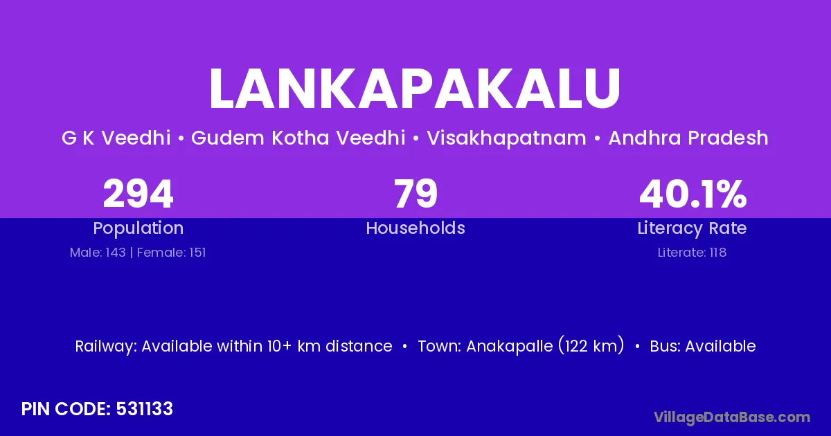 Lankapakalu village has a total population of 294 people, of which 143 are males and 151 are females.