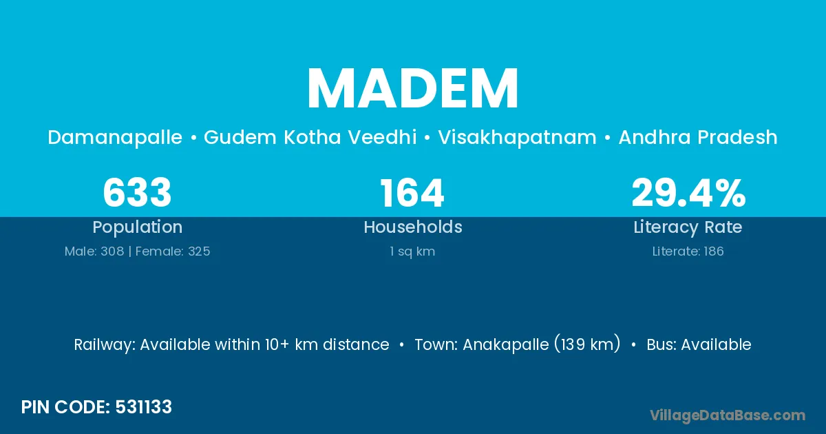 Anakapalle (139 km) is the nearest town to Madem village for major economic activities and is located approximately 139 km away.