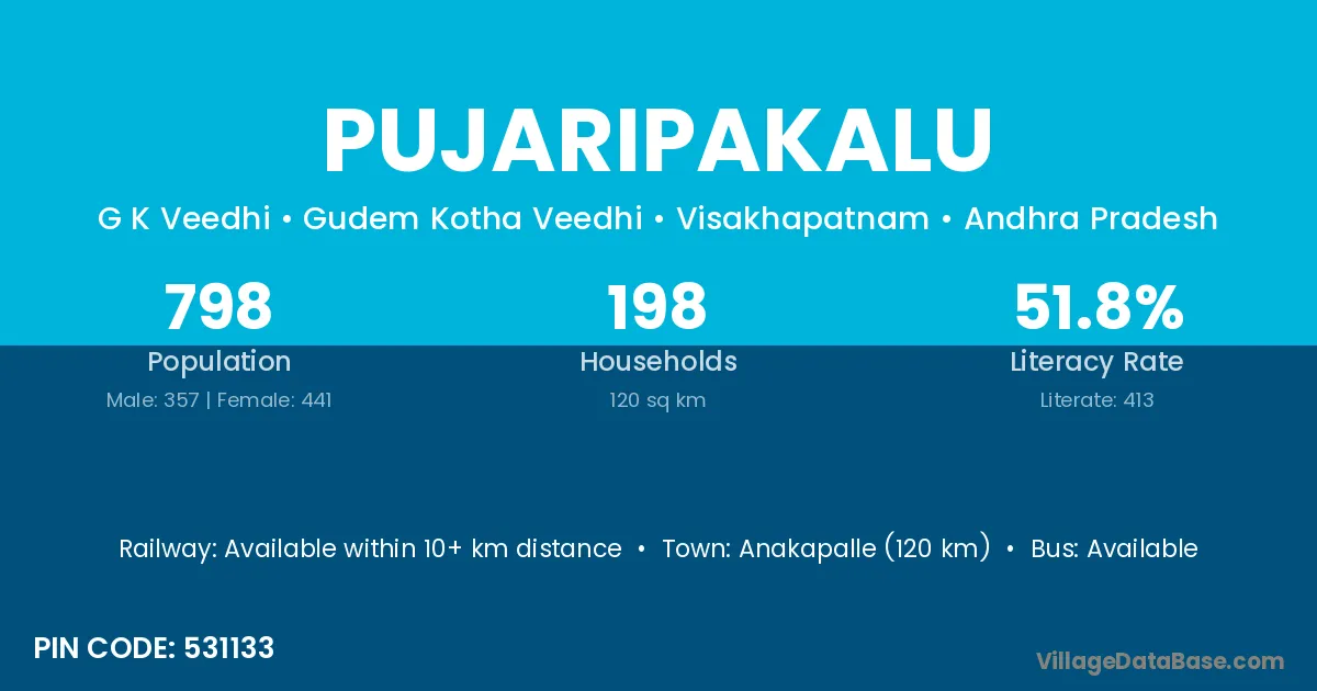 Anakapalle (120 km) is the nearest town to Pujaripakalu village for major economic activities and is located approximately 120 km away.