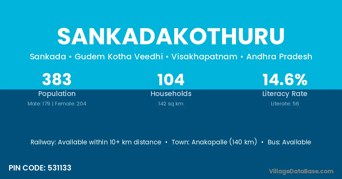 Sankadakothuru village has a total population of 383 people, of which 179 are males and 204 are females.