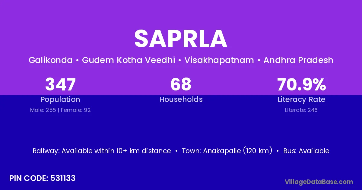 Anakapalle (120 km) is the nearest town to Saprla village for major economic activities and is located approximately 120 km away.