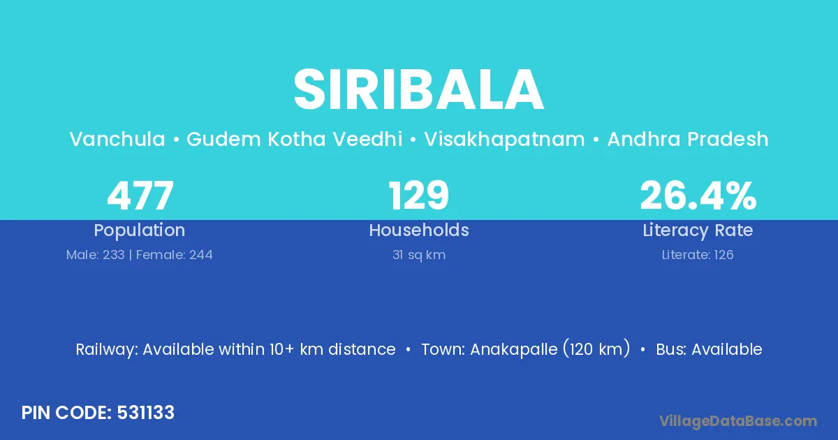 Anakapalle (120 km) is the nearest town to Siribala village for major economic activities and is located approximately 120 km away.