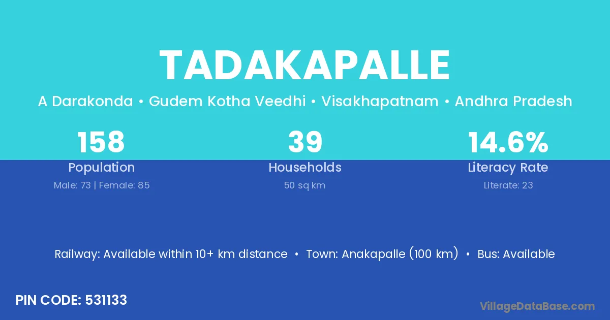 Anakapalle (100 km) is the nearest town to Tadakapalle village for major economic activities and is located approximately 100 km away.