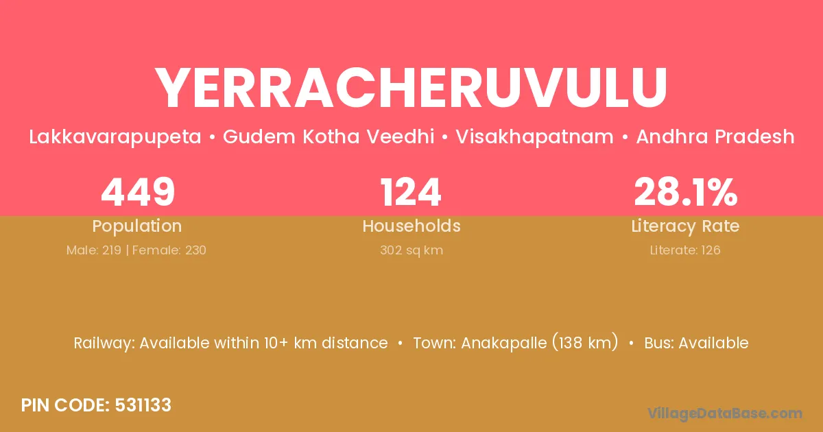 Yerracheruvulu village has a total population of 449 people, of which 219 are males and 230 are females.