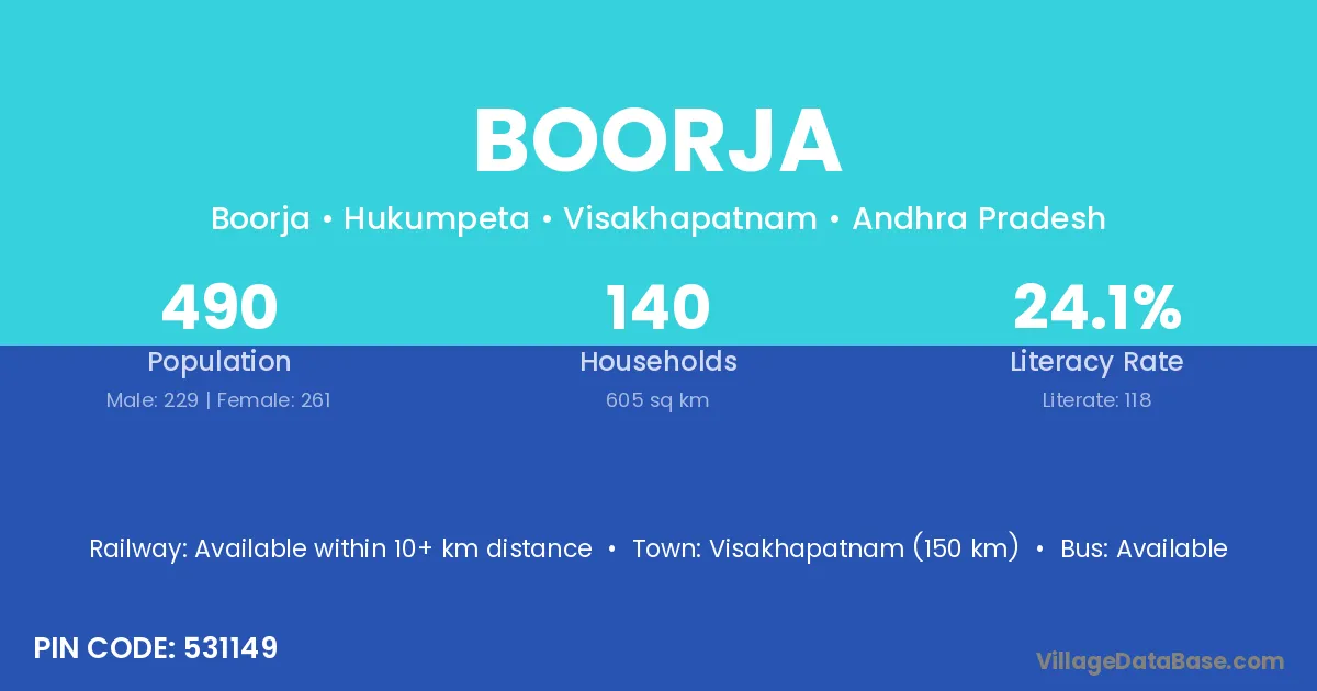 Visakhapatnam (150 km) is the nearest town to Boorja village for major economic activities and is located approximately 150 km away.