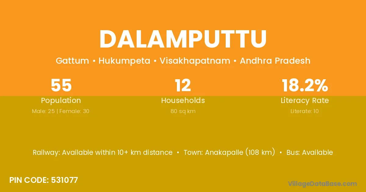 Anakapalle (108 km) is the nearest town to Dalamputtu village for major economic activities and is located approximately 108 km away.