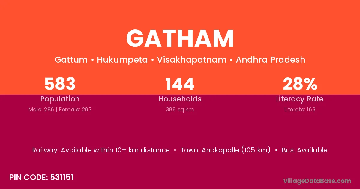 Anakapalle (105 km) is the nearest town to Gatham village for major economic activities and is located approximately 105 km away.