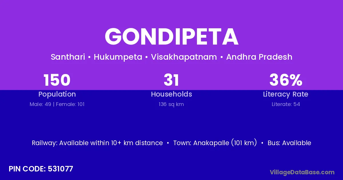Anakapalle (101 km) is the nearest town to Gondipeta village for major economic activities and is located approximately 101 km away.