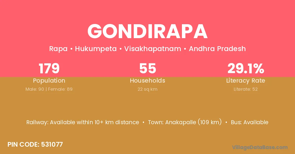Anakapalle (109 km) is the nearest town to Gondirapa village for major economic activities and is located approximately 109 km away.