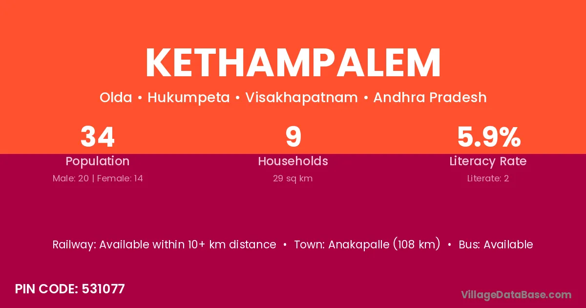 Kethampalem village has a total population of 34 people, of which 20 are males and 14 are females.