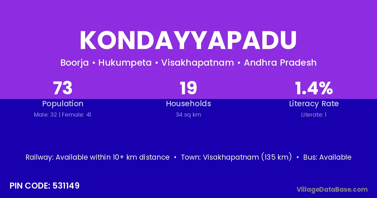 Kondayyapadu village has a total population of 73 people, of which 32 are males and 41 are females.