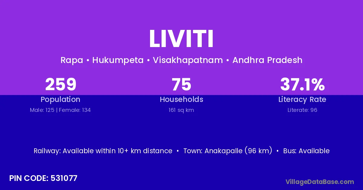 Anakapalle (96 km) is the nearest town to Liviti village for major economic activities and is located approximately 96 km away.