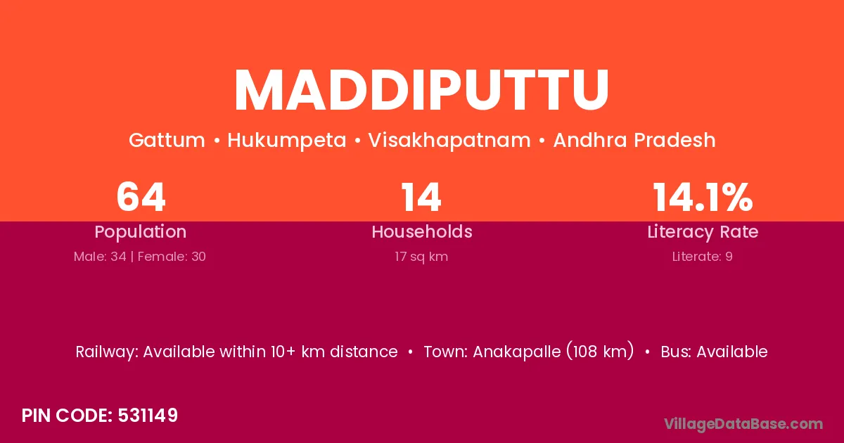 Anakapalle (108 km) is the nearest town to Maddiputtu village for major economic activities and is located approximately 108 km away.