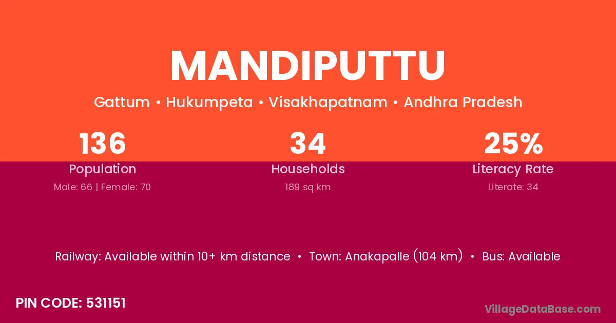 Mandiputtu village has a total population of 136 people, of which 66 are males and 70 are females.