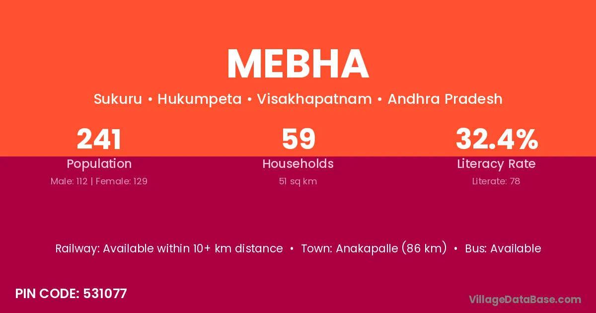 Anakapalle (86 km) is the nearest town to Mebha village for major economic activities and is located approximately 86 km away.