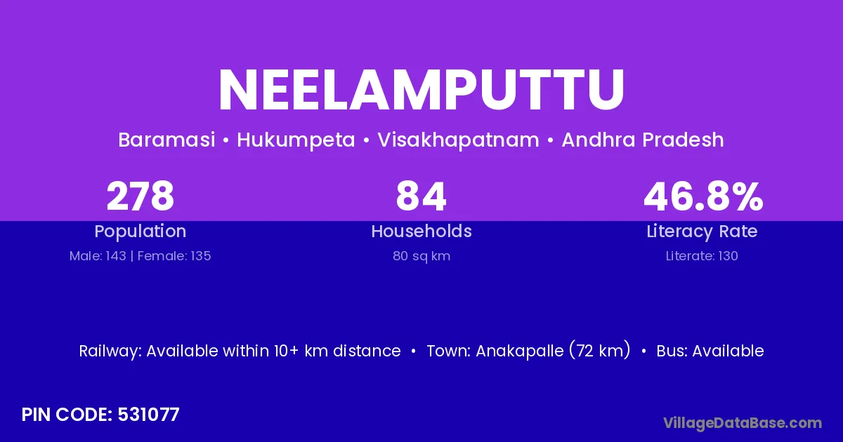 Anakapalle (72 km) is the nearest town to Neelamputtu village for major economic activities and is located approximately 72 km away.