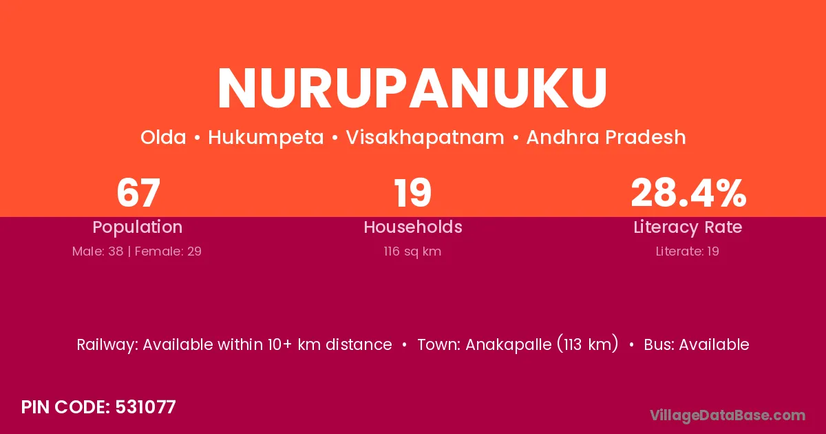 Anakapalle (113 km) is the nearest town to Nurupanuku village for major economic activities and is located approximately 113 km away.