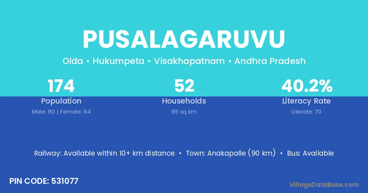 Pusalagaruvu village has a total population of 174 people, of which 80 are males and 94 are females.