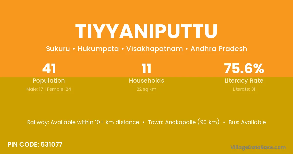 Anakapalle (90 km) is the nearest town to Tiyyaniputtu village for major economic activities and is located approximately 90 km away.