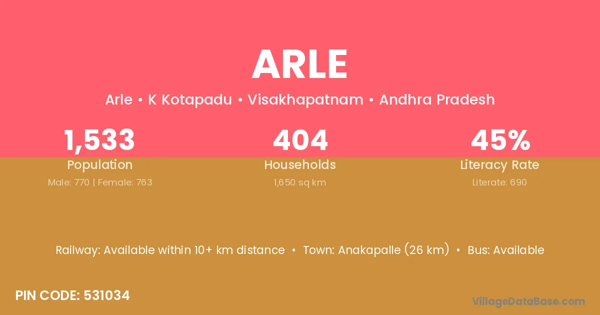 Anakapalle (26 km) is the nearest town to Arle village for major economic activities and is located approximately 26 km away.