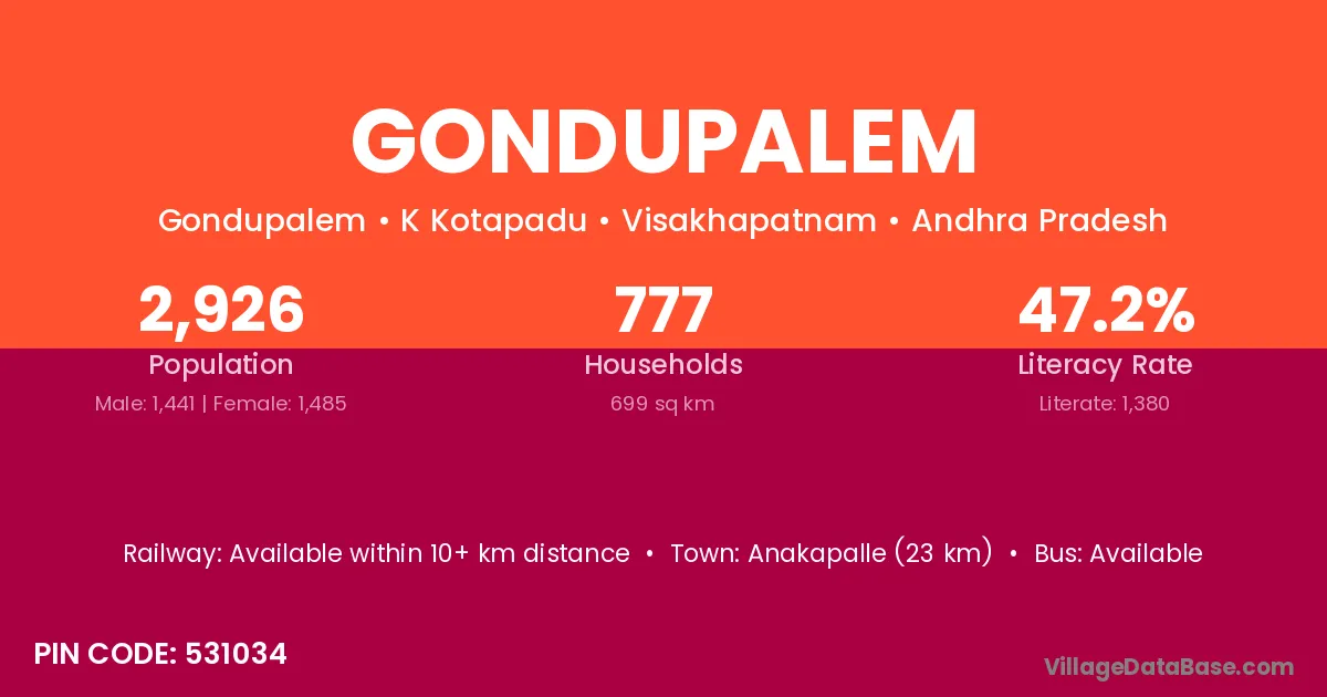 Anakapalle (23 km) is the nearest town to Gondupalem village for major economic activities and is located approximately 23 km away.