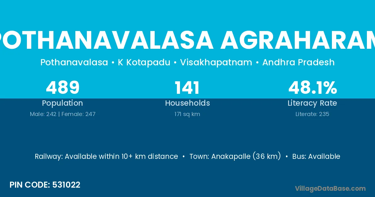 Pothanavalasa Agraharam village has a total population of 489 people, of which 242 are males and 247 are females.