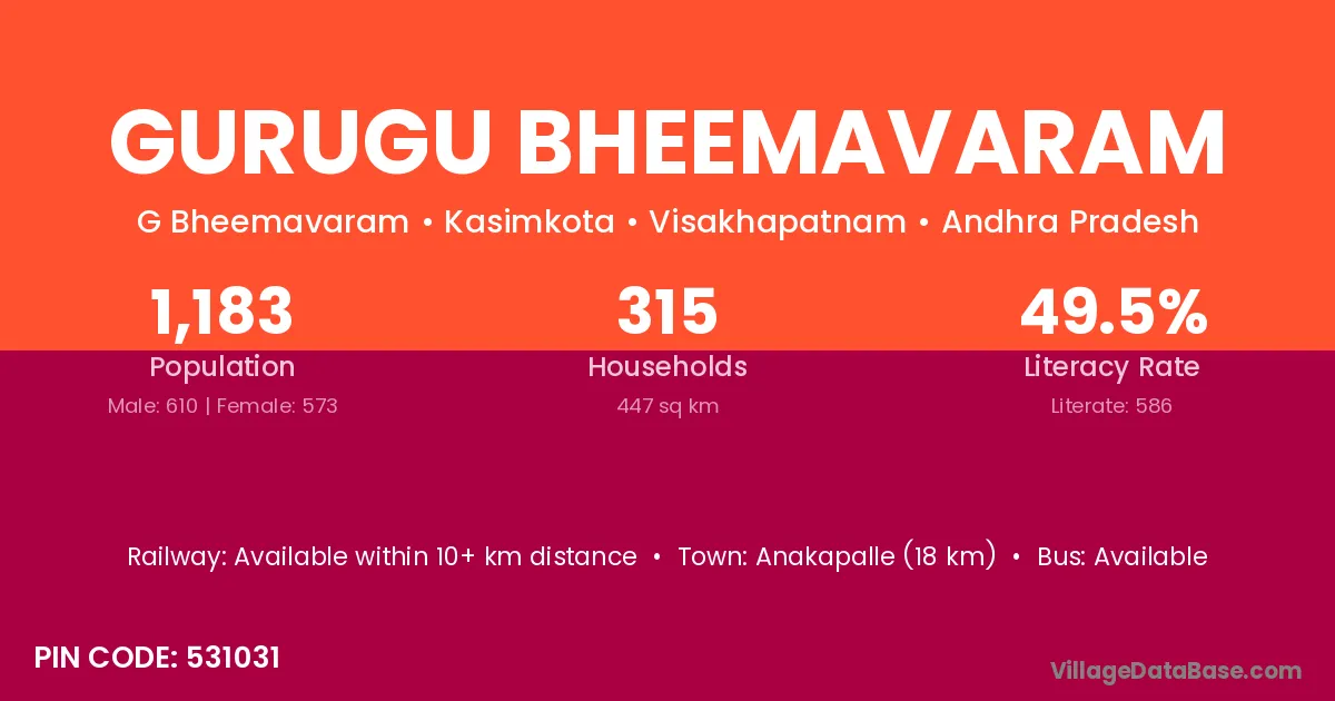 Anakapalle (18 km) is the nearest town to Gurugu Bheemavaram village for major economic activities and is located approximately 18 km away.