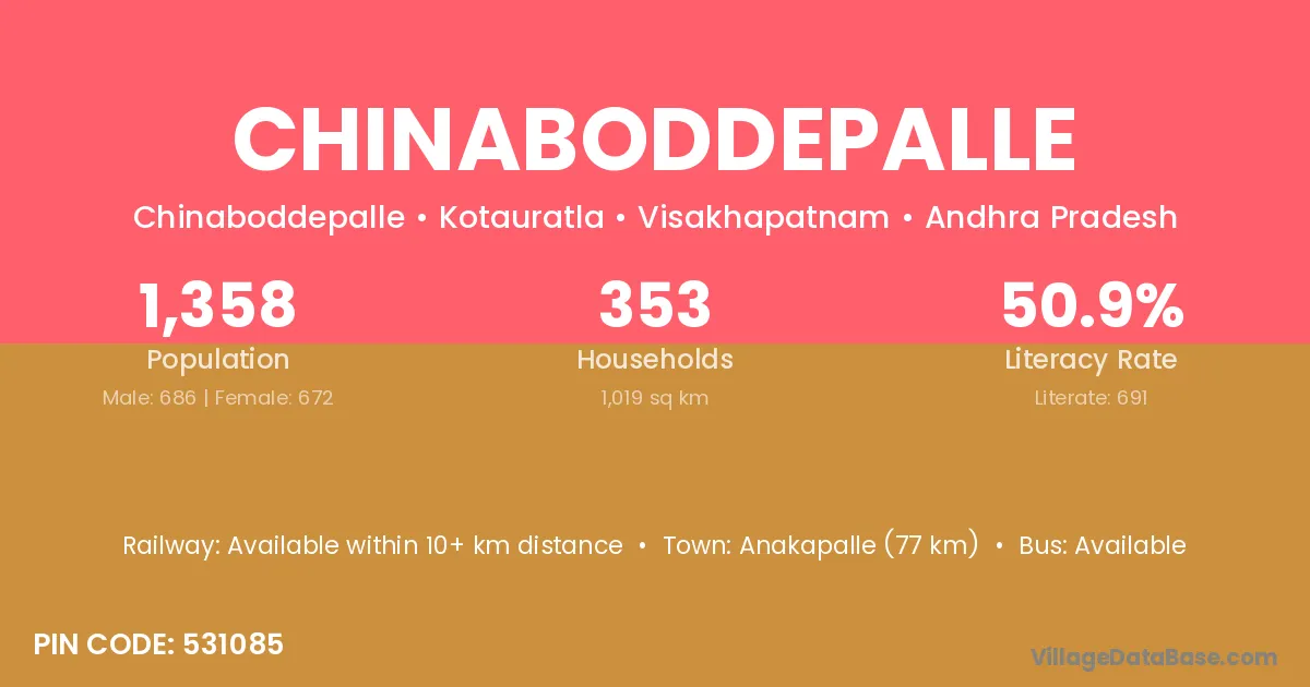 Chinaboddepalle village has a total population of 1,358 people, of which 686 are males and 672 are females.
