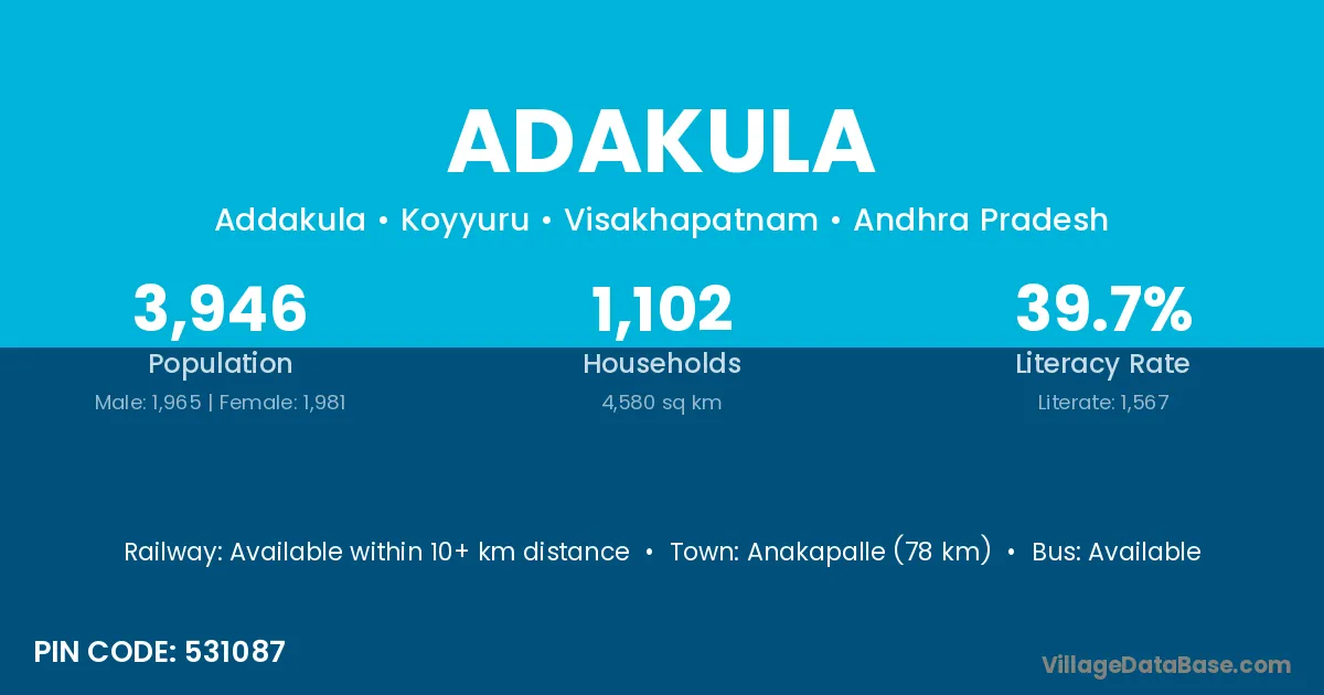 Anakapalle (78 km) is the nearest town to Adakula village for major economic activities and is located approximately 78 km away.