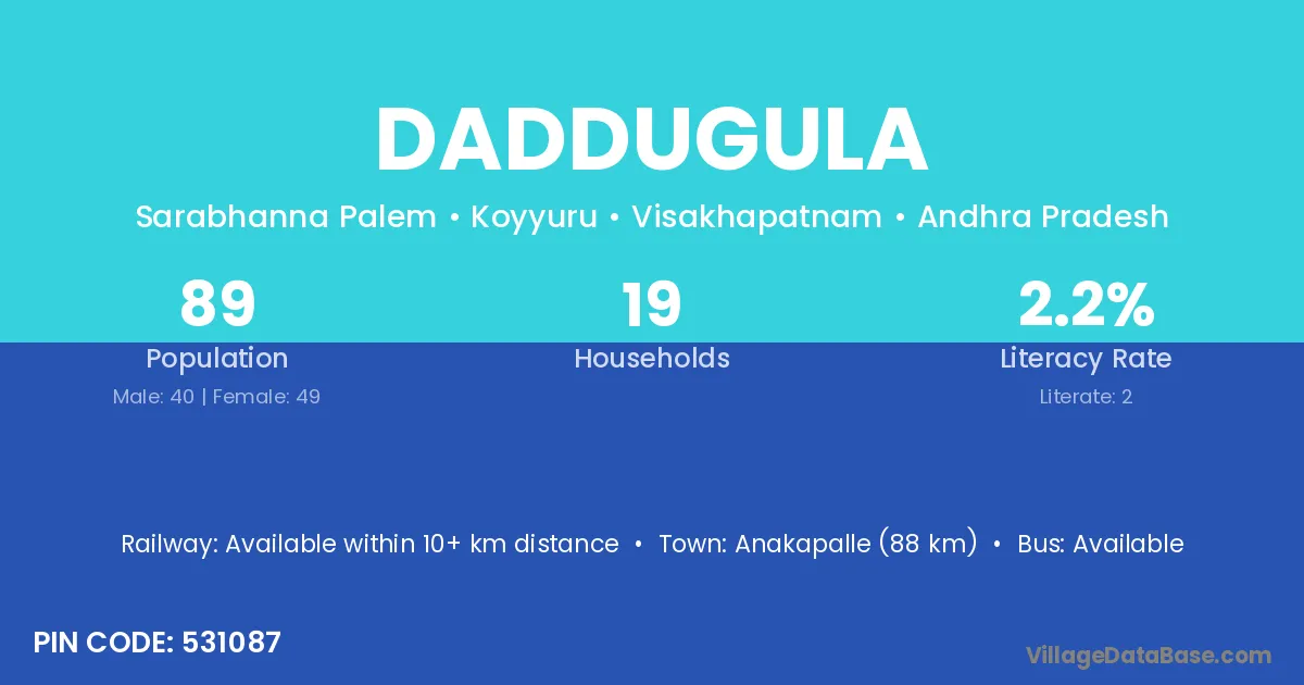 Anakapalle (88 km) is the nearest town to Daddugula village for major economic activities and is located approximately 88 km away.