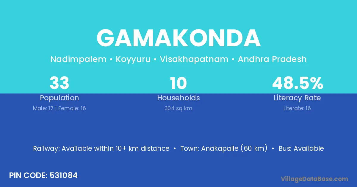 Anakapalle (60 km) is the nearest town to Gamakonda village for major economic activities and is located approximately 60 km away.