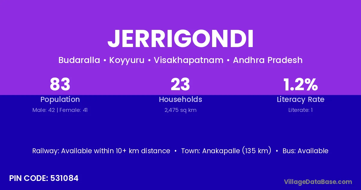 Anakapalle (135 km) is the nearest town to Jerrigondi village for major economic activities and is located approximately 135 km away.