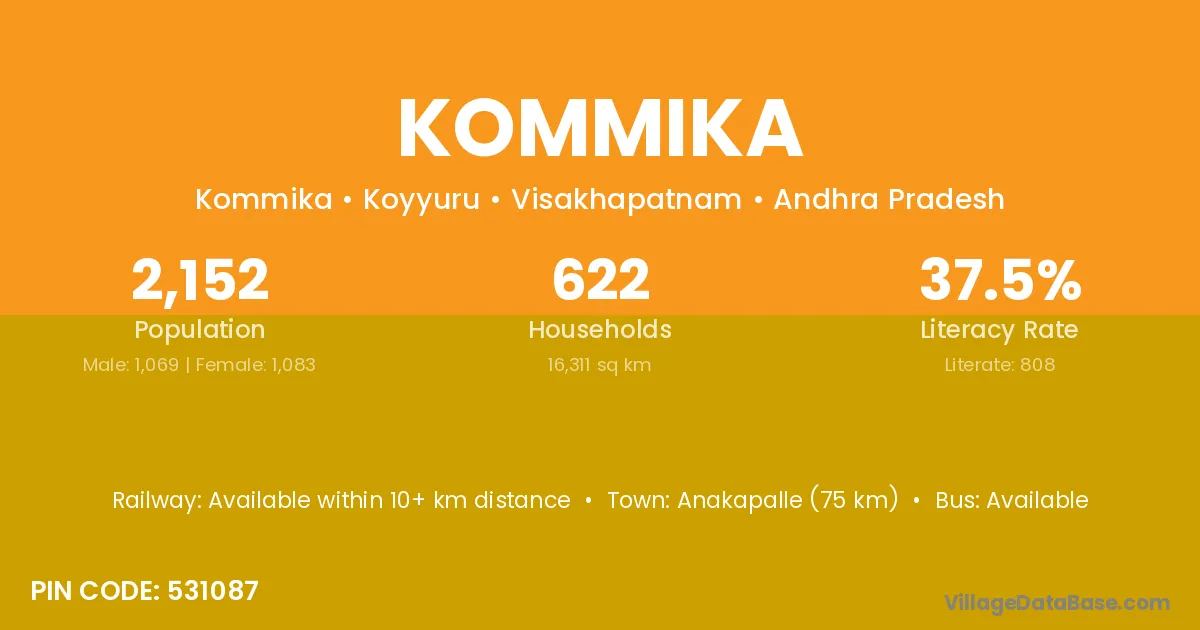 Anakapalle (75 km) is the nearest town to Kommika village for major economic activities and is located approximately 75 km away.