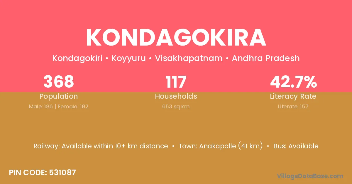 Anakapalle (41 km) is the nearest town to Kondagokira village for major economic activities and is located approximately 41 km away.